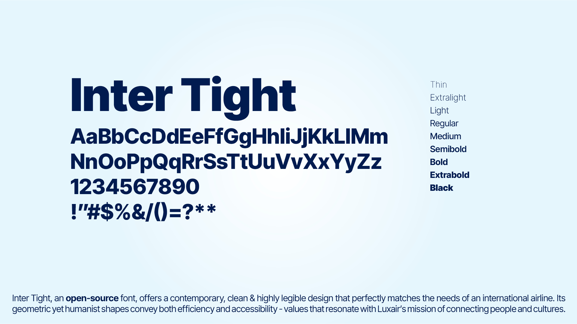 Inter Right, an open-source font, offers a contemporary, clean & highly legible design that perfectly matches the needs of and international airline. Its geometric yet humanist shapes convey both efficiency and accessibility – values that resonate with Luxair’s mission of connecting people and cultures.