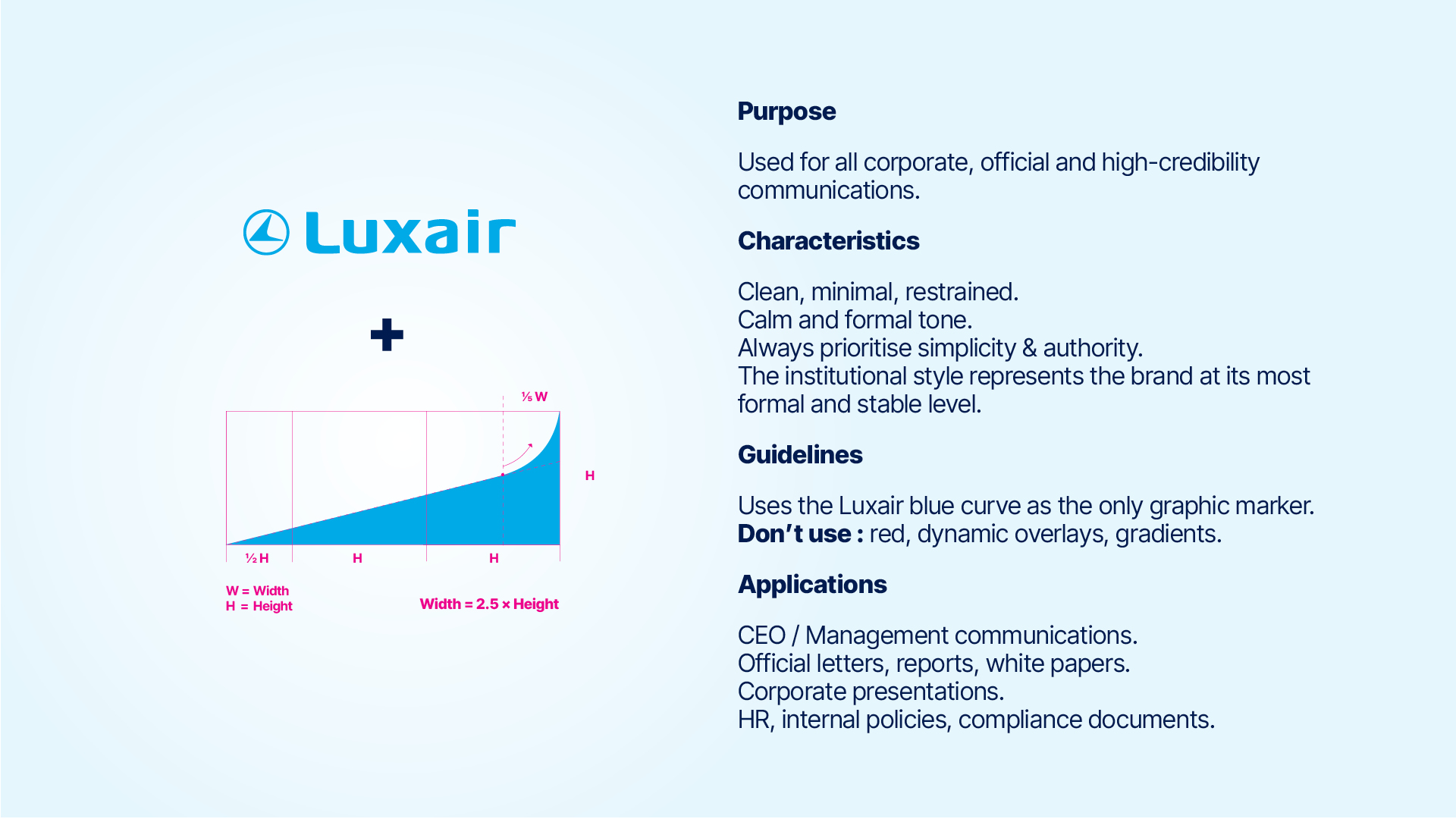 Uses the Luxair blue curve as the only graphic marker.